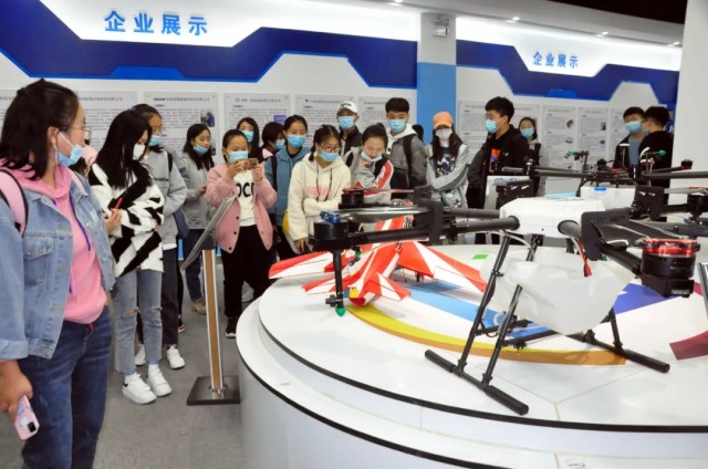 在子園區(qū)產(chǎn)品展廳,同學(xué)們被展臺上的多旋翼植保無人機、取苗機械手、栽植機械手等產(chǎn)品吸引了注意力,紛紛拿起手機對著展臺拍起照來。子園區(qū)河南科技大學(xué)·大學(xué)科技園工作人員介紹了河科大師生創(chuàng)新企業(yè)、團隊的研發(fā)成果及市場應(yīng)用情況,同學(xué)們聽后連連贊嘆。